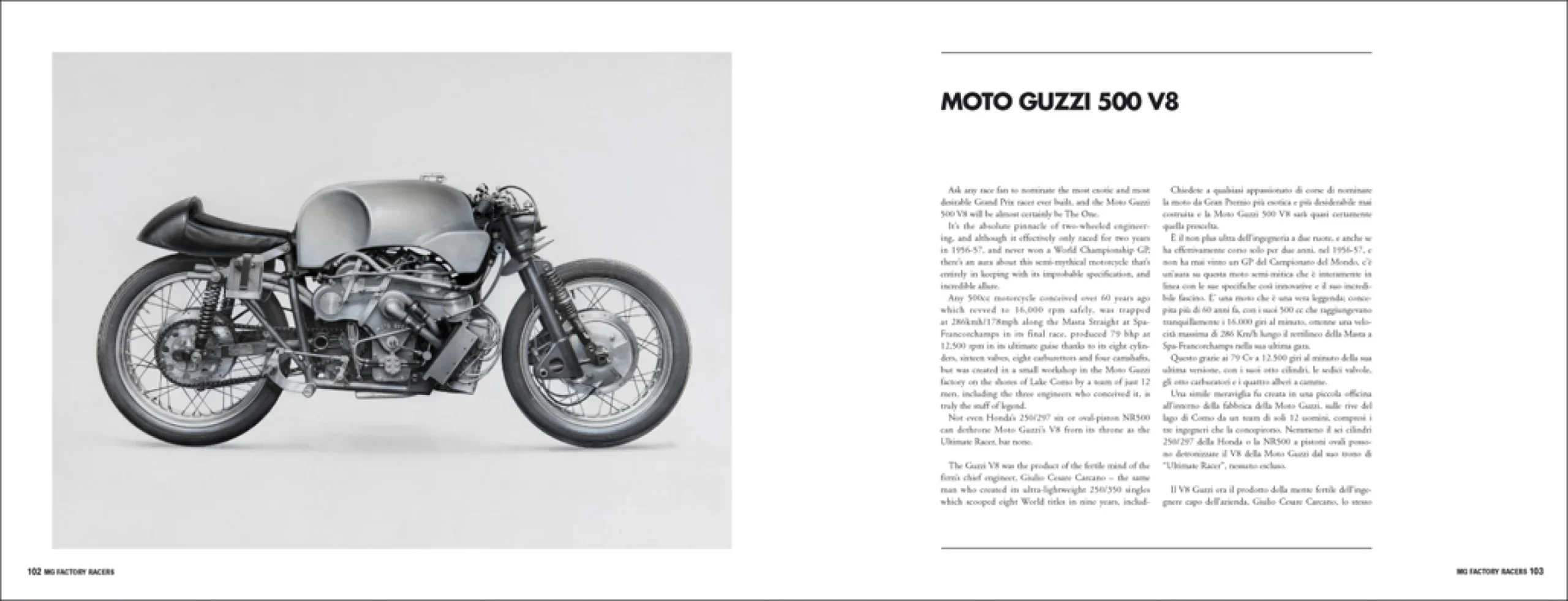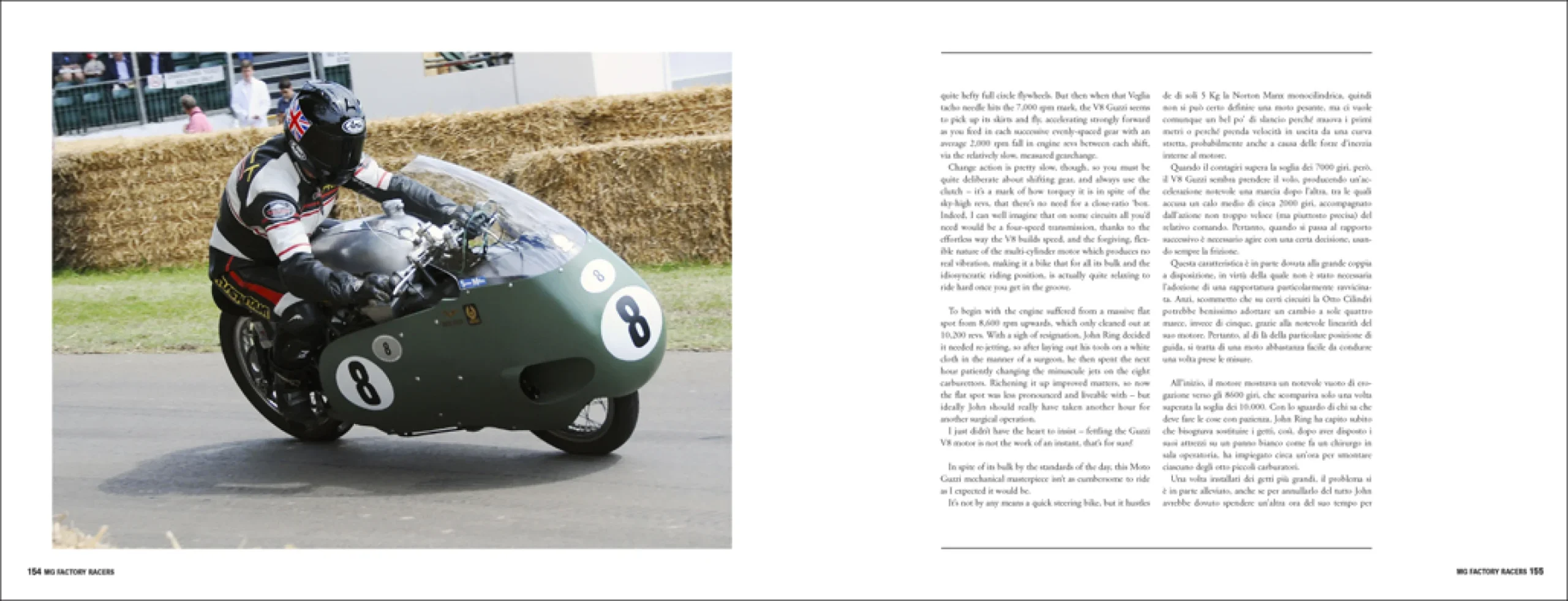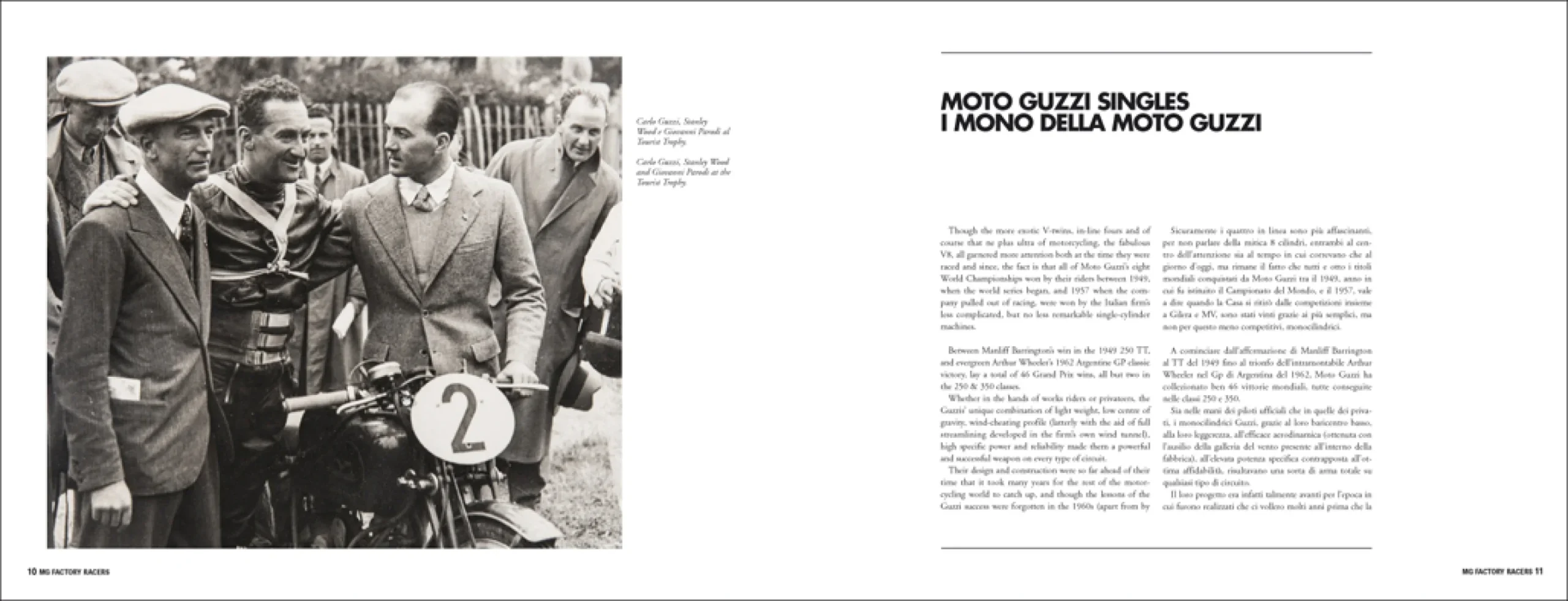 The book “Moto Guzzi Factory Racers” is an extraordinary work that chronicles the history of Moto Guzzi racing motorcycles produced between 1921 and 1957, a golden era for the Italian brand. Written by renowned motorcycle journalist Alan Cathcart, this volume provides a detailed analysis of the technical and riding characteristics of these iconic bikes, with the author having had the unique privilege of personally test-riding them. Among the most legendary motorcycles featured are the Bicilindrica and the powerful Otto Cilindri, both marvels of their time. This premium edition book comes in a large format (30×23 cm), with 160 pages printed on high-quality paper, and a hardcover. In addition to its rich historical and technical content, the book is enhanced with vintage photographs that enrich the stories. Available in a bilingual edition, with text in both Italian and English, “Moto Guzzi Factory Racers” is a must-read for motorcycle enthusiasts and anyone who wants to explore the iconic bikes that shaped the world of racing.