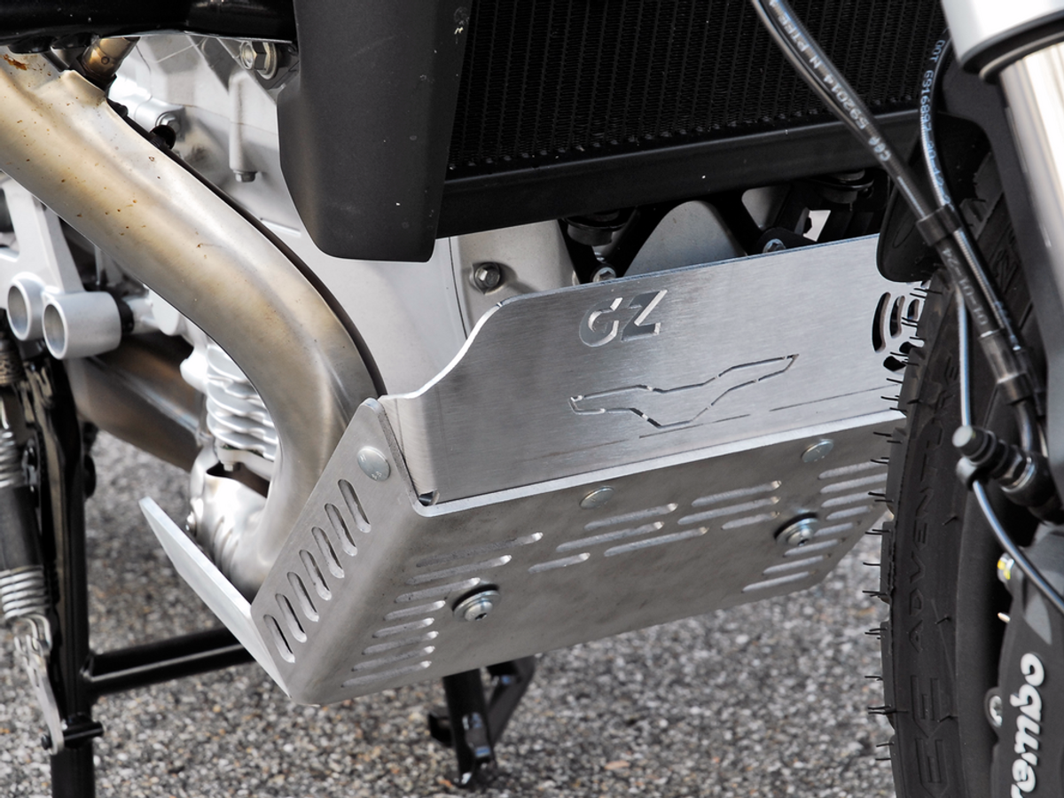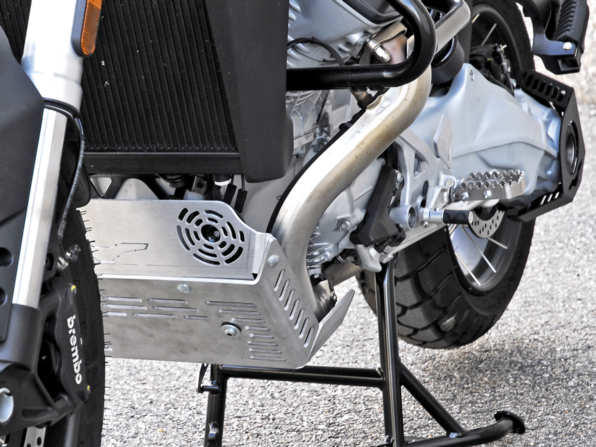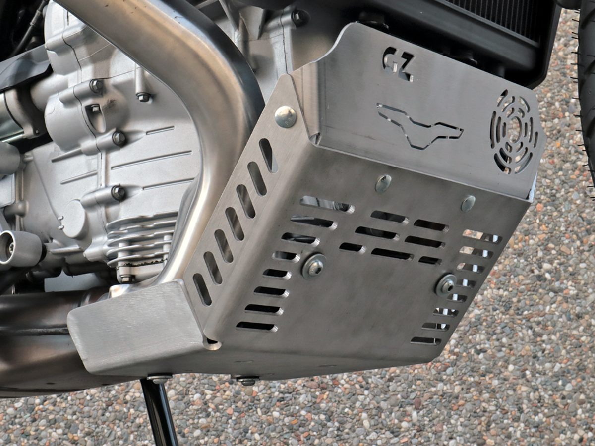 Skid Plate Stelvio V100 by GZ Sport (code SM402105X) is designed to protect the engine cases and headers on Moto Guzzi Stelvio 2024. Weight: 2.7 kg. Made from structural aluminum, it focuses on build quality and consistency: laser cut, TIG welding and attention to detail. The result is a strong, well-finished component built for real-world vibration and stress. In everyday riding it keeps your setup more functional and tidy with fewer compromises. Installation is straightforward: confirm fitment on your bike and use the intended hardware to achieve a stable, long-lasting mount.